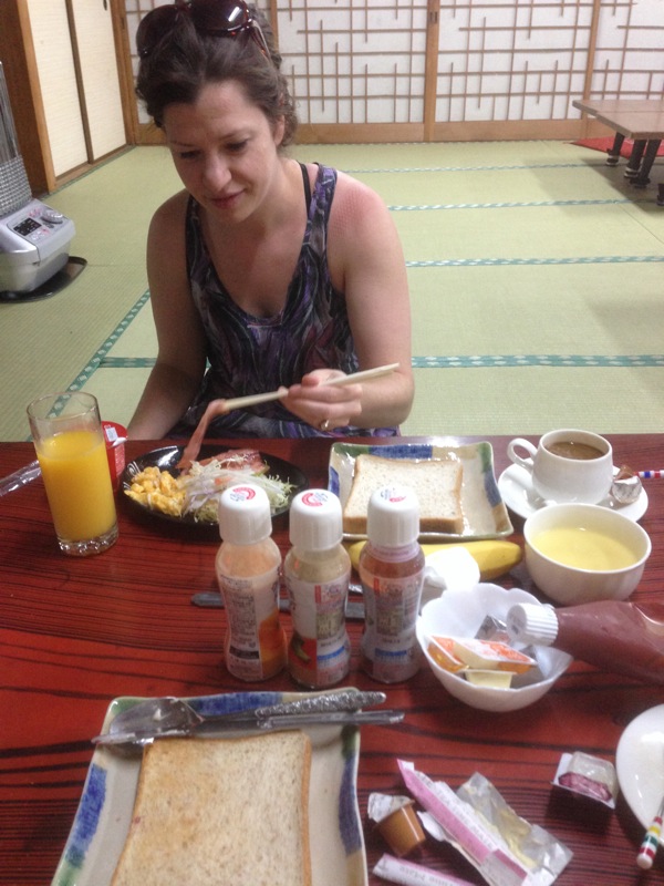 IMG_6071_800 Published June 21, 2014 at 600 × 800 in Kyoto 2 ← Previous Next → Up early for our day hike on the UNESCO Heritage Trail. Breakfast comes with the room. We chose a western style meal. Casey is trying to figure out what the fried meat is.